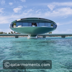 Stand in front of one of the orbs and they seem to disappear into the horizon, shimmering almost like a mirage. The bottom of the villas reflects sea or sand and the roof reflects the sky, constantly changing from sunrise to sunset, becoming part of the environment that surrounds them. Overwater villas are Suspended above the waves, and a mere stone’s throw from colorful coral gardens that surround the resort. Set back over 50 meters from the natural coral reef, the villas’ supporting columns touch only a few square meters of ground, a light touch approach that aligns with the enduring commitment to protect the thriving habitats of the lagoon. “The result is an aerial accommodation pod that almost seems to defy gravity, and suspends the guest directly above and within the beauty of this marine eco-system,” says Killa. “Each overwater villa is like an observation platform for guests to witness the fish, birds and turtles that thrive in this area.”